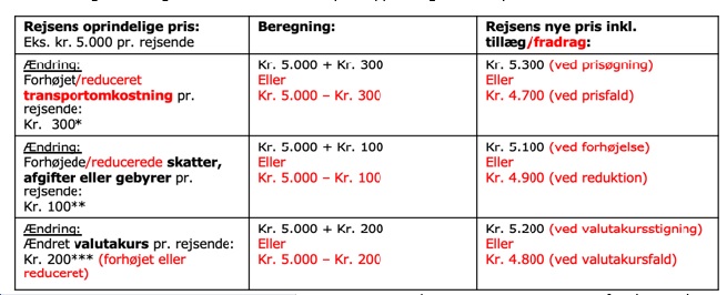 Rejsearrangøren forbeholder sig ret til, inden afrejsedagen, at foretage sådanne prisændringer, som skyldes ændringer i transportomkostninger (f.eks. brændstofpriser), skatter, afgifter eller gebyrer (f.eks. lufthavns-, start- eller landingsafgifter) eller valutakurser, som er anvendt til beregning af prisen for den pågældende rejse. Det gælder også selvom rejsen er slutbetalt. Hvis lufthavnsafgiften eksempelvis stiger kr. 100,-, forhøjes rejsens pris tilsvarende. Hvis prisen forhøjes mere end 8%, er kunden berettiget til at annullere rejsen og få det indbetalte beløb refunderet uden unødig forsinkelse og senest 14 dage efter annulleringen. Det er dog en betingelse, at annulleringen meddeles rejsearrangøren umiddelbart efter, at kunden er blevet underrettet om prisforhøjelsen. I modsat fald betragtes den rejsende at have accepteret prisforhøjelsen.