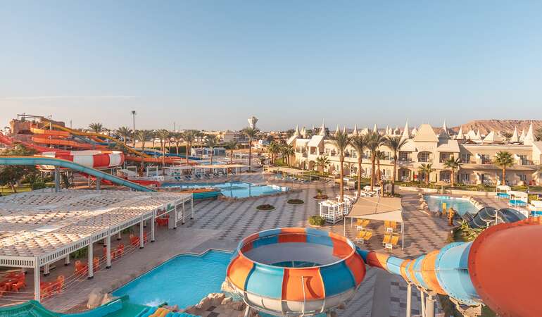 • Med sine 32 pools – 1 opvarmet pool til voksne, 1 opvarmet pool til børn, 34 vandrutsjebaner og 19 swimmingpools – er dette resort i Hurghada en sand forlystelsespark.