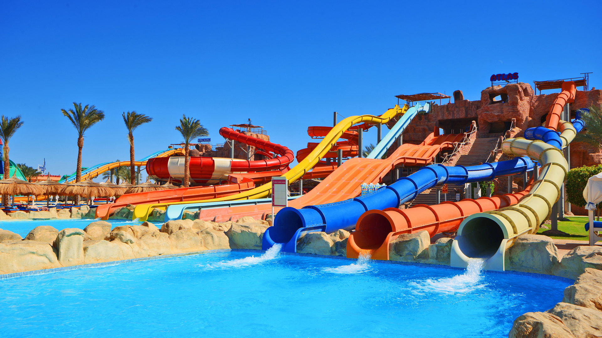 Vattenpark med 7 pooler och 17 rutschbanor för vuxna.