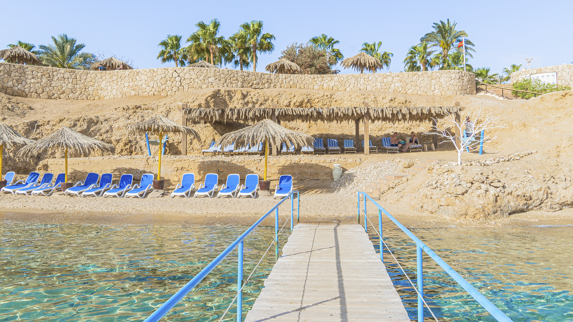 Strand med brygga och bra snorklingsförhållanden