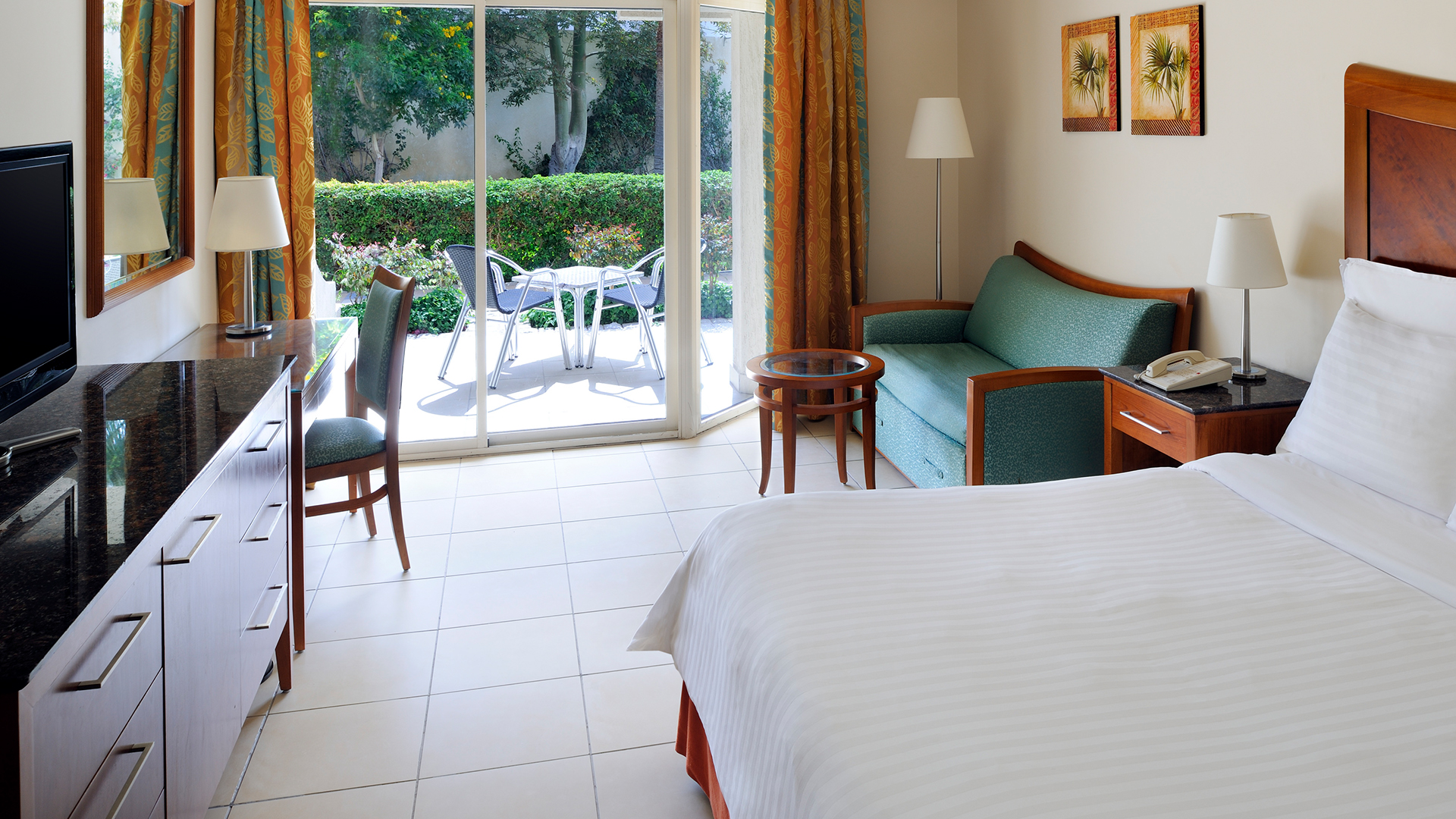 Med king size-säng eller två enkelsängar. Trädgårdsutsikt, kan bokas med pool- eller havsutsikt