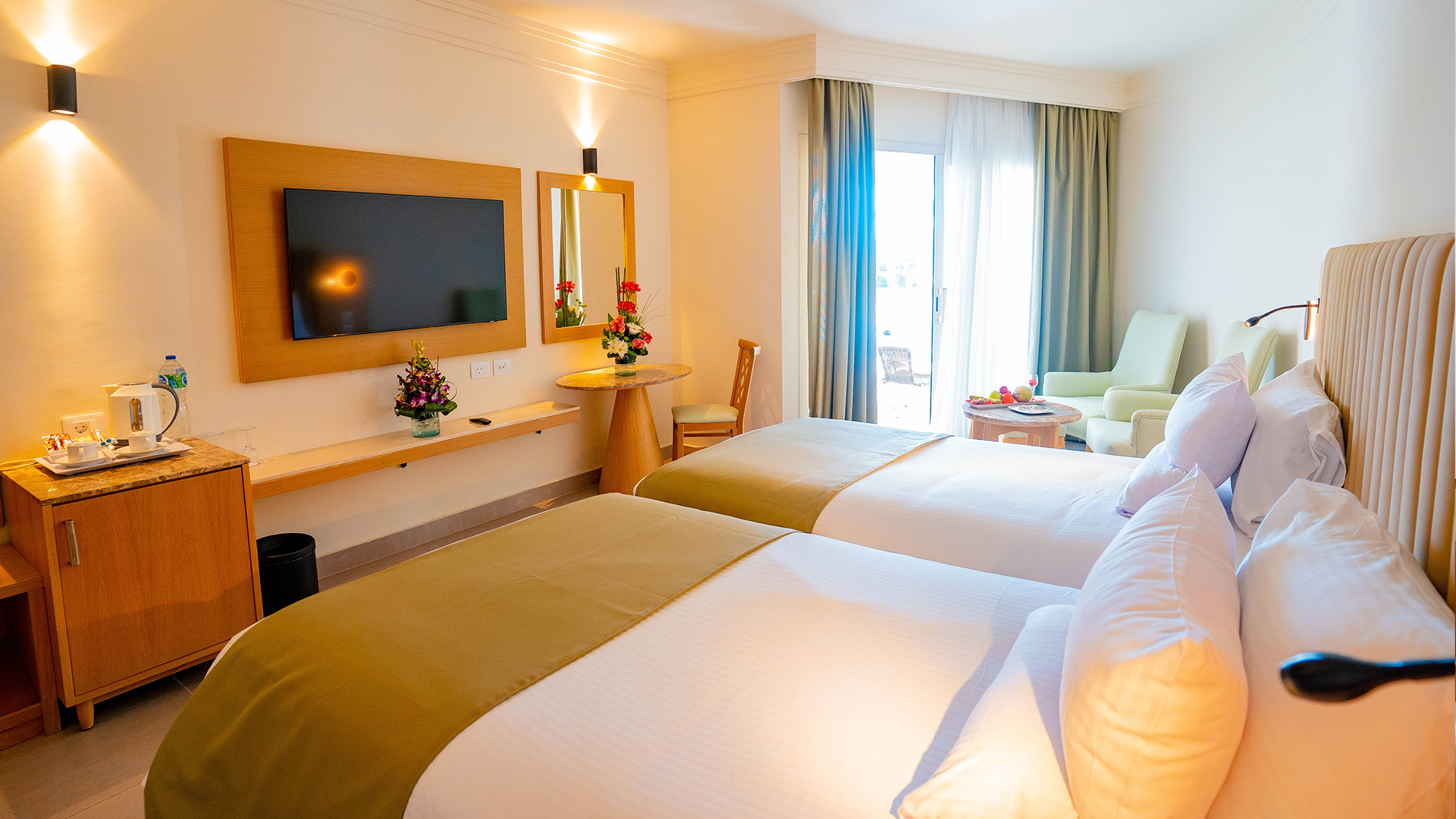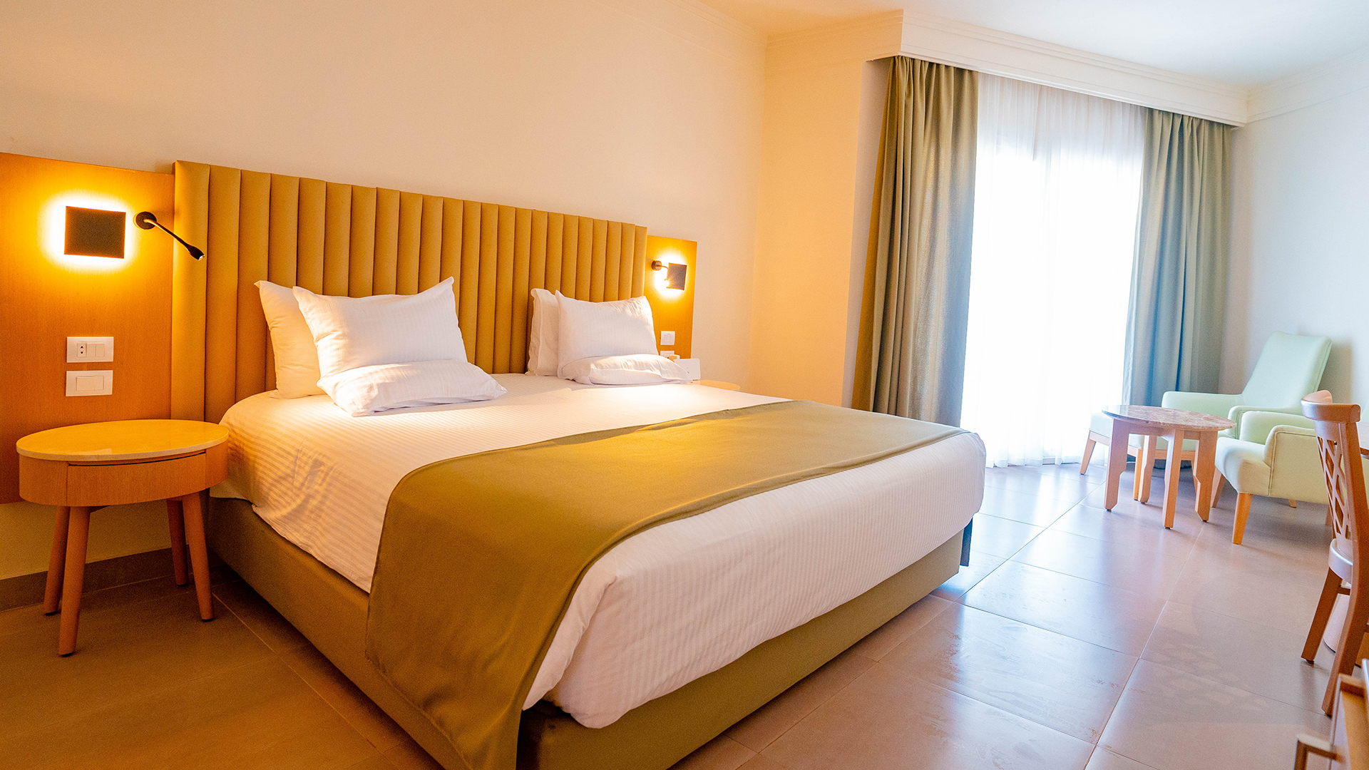 Hotellets rum ligger i 2-våningshus på ett stort område på båda sidor om en större väg. Alla våra rum ligger på vattensidan och har antingen balkong eller terrass med utsikt över poolen eller grönområden.