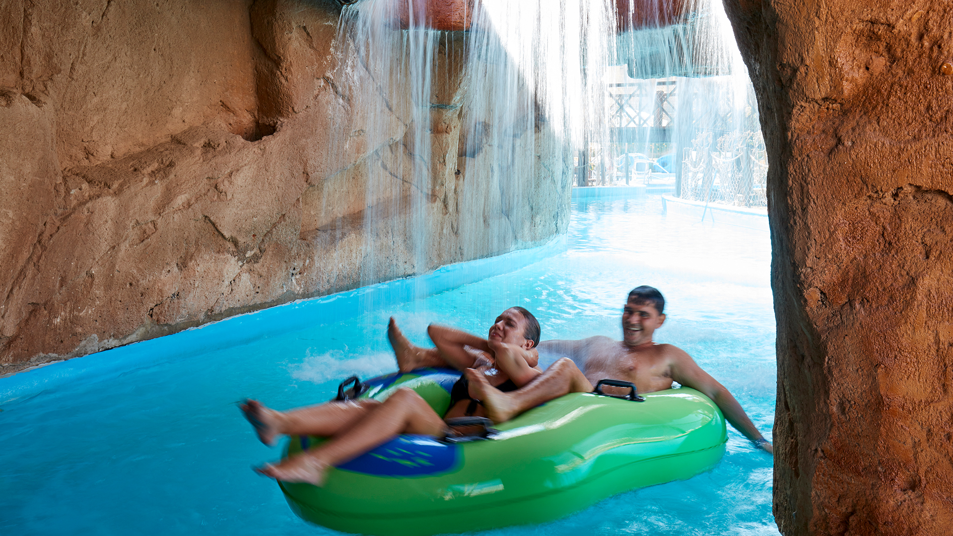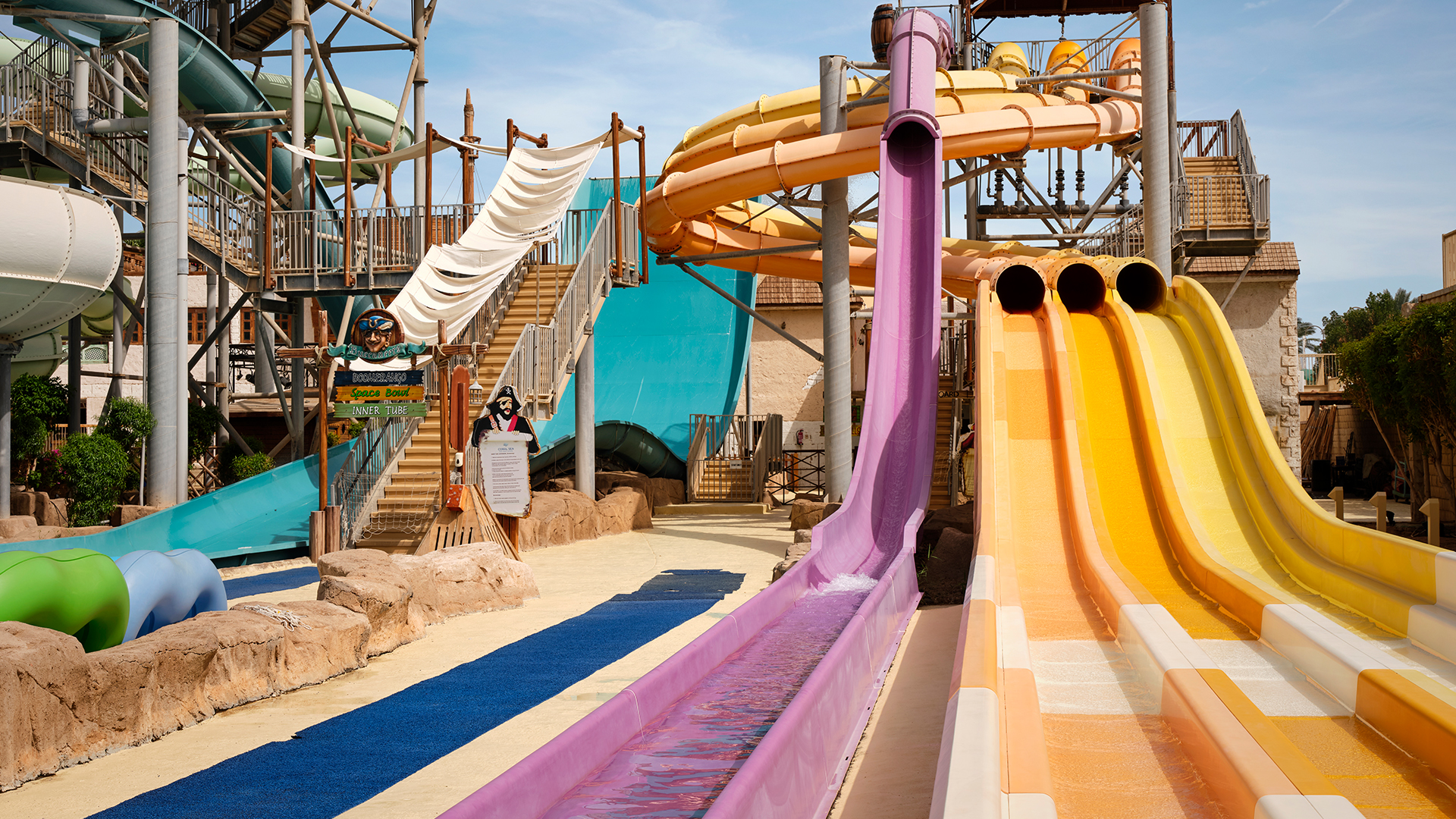Vattenpark med flera rutschbanor och pool - 120 cm är minimihöjden i vattenparken, det finns inga åldersbegränsningar. Barn måste övervakas av vuxna när de använder vattenrutschbanorna.