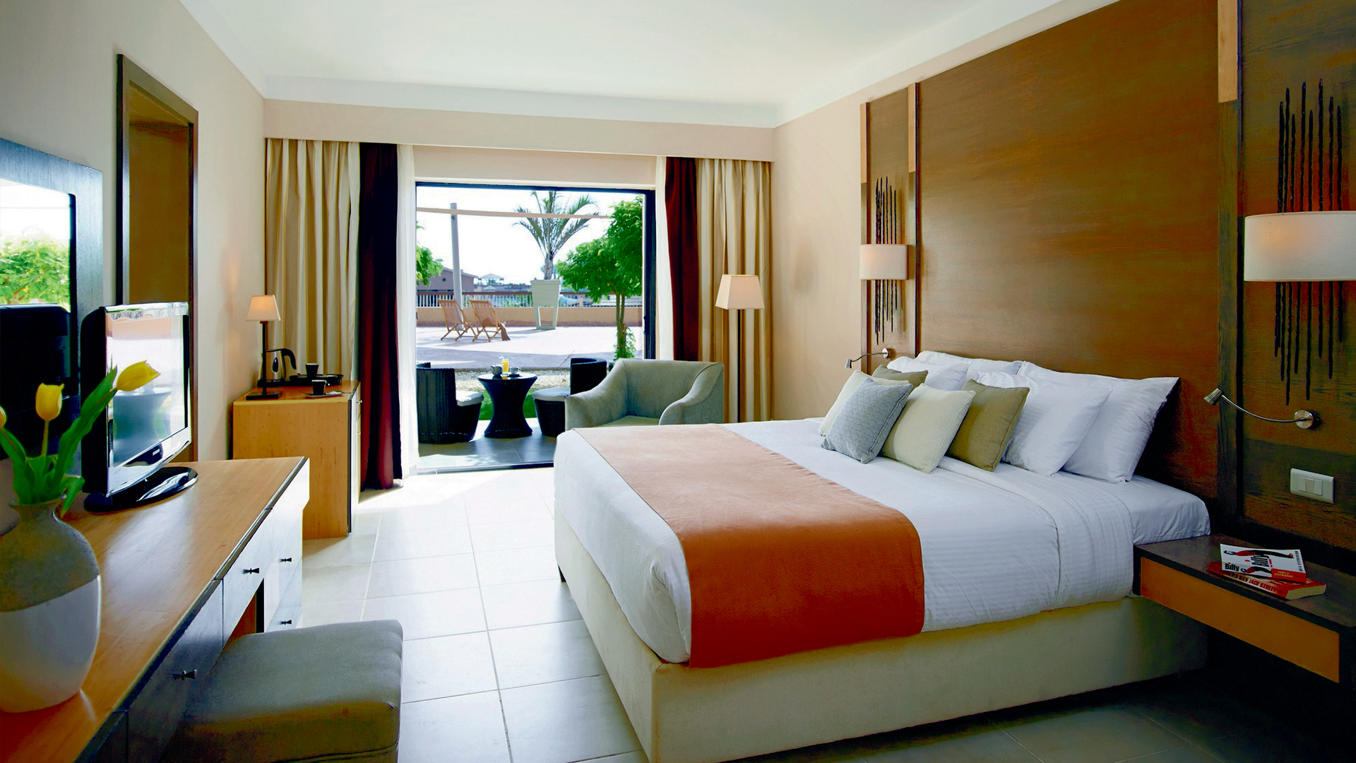 Master bedroom med king size-säng och två bäddsoffor i en extra sovdel som skiljs åt med en skjutdörr. Utsikt över poolen/vattenparken eller trädgården.