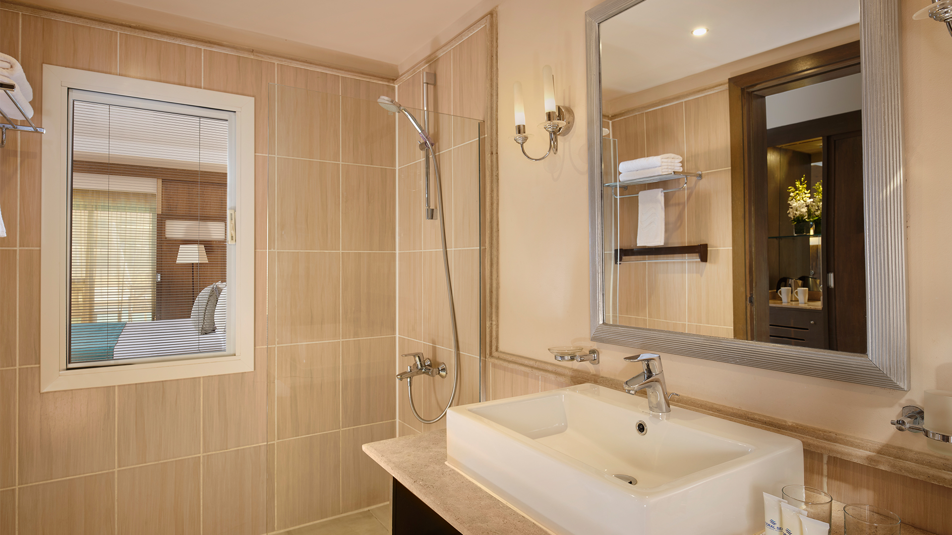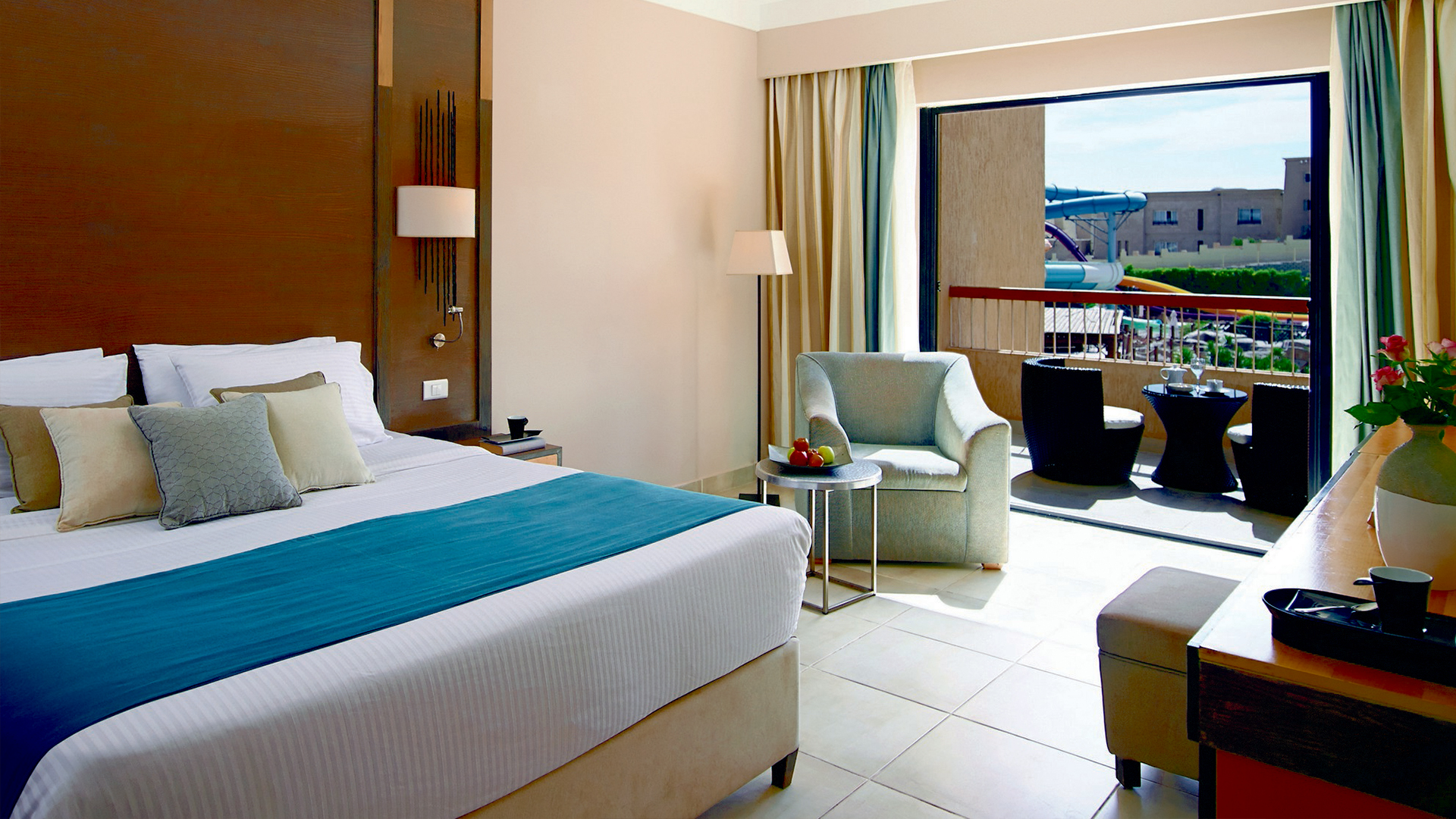Med en king size-säng eller två enkelsängar samt en bäddsoffa. Utsikt över poolen/vattenparken eller trädgården.