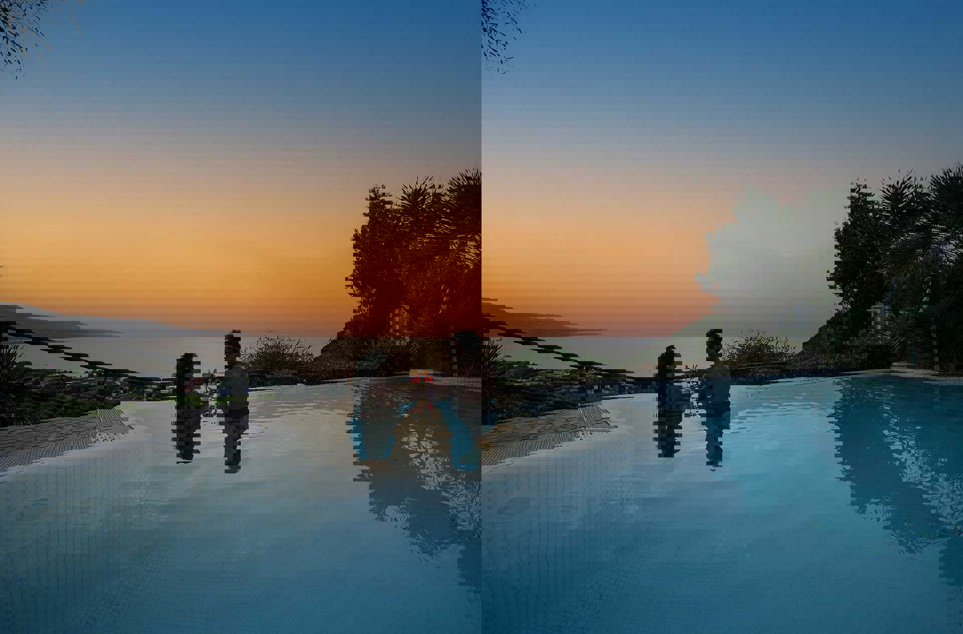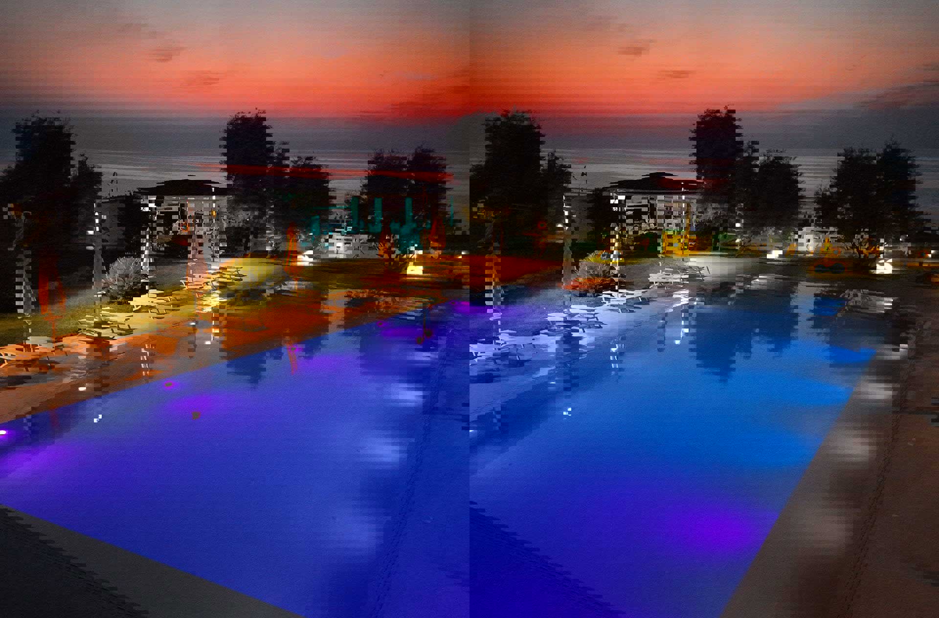 2 utomhuspooler med parasoller och solstolar