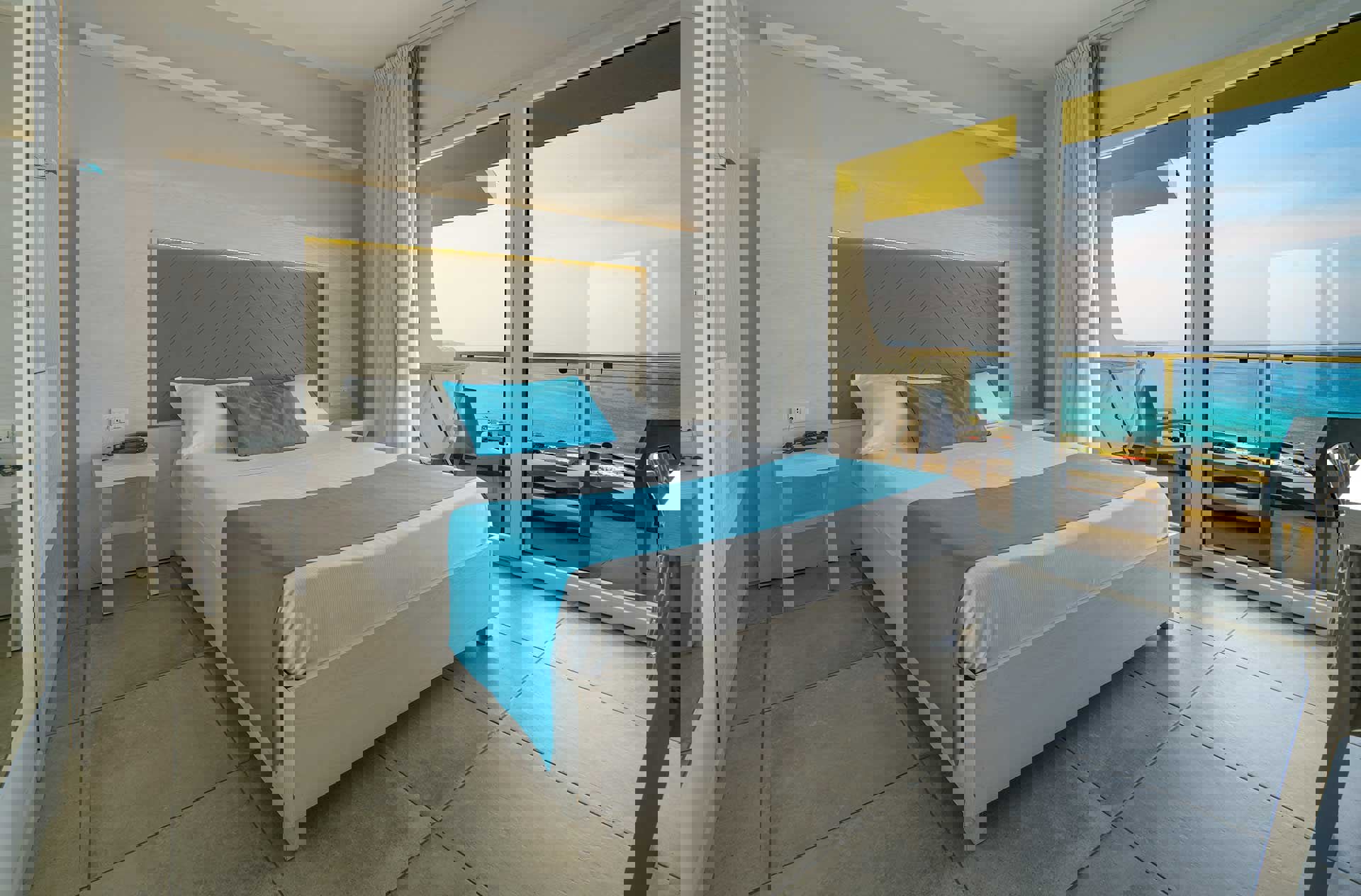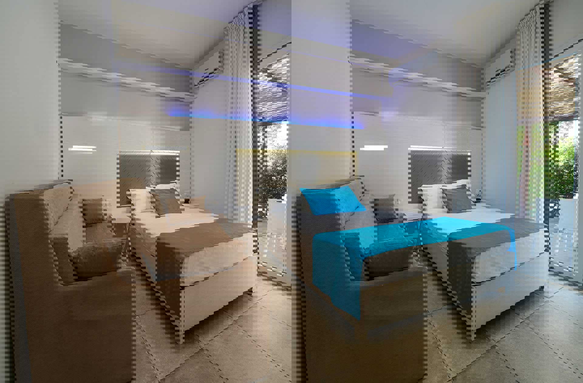 Fördelat på 2 våningar: på bottenvåningen finns en privat uteplats och på första våningen finns en balkong med fantastisk havsutsikt.