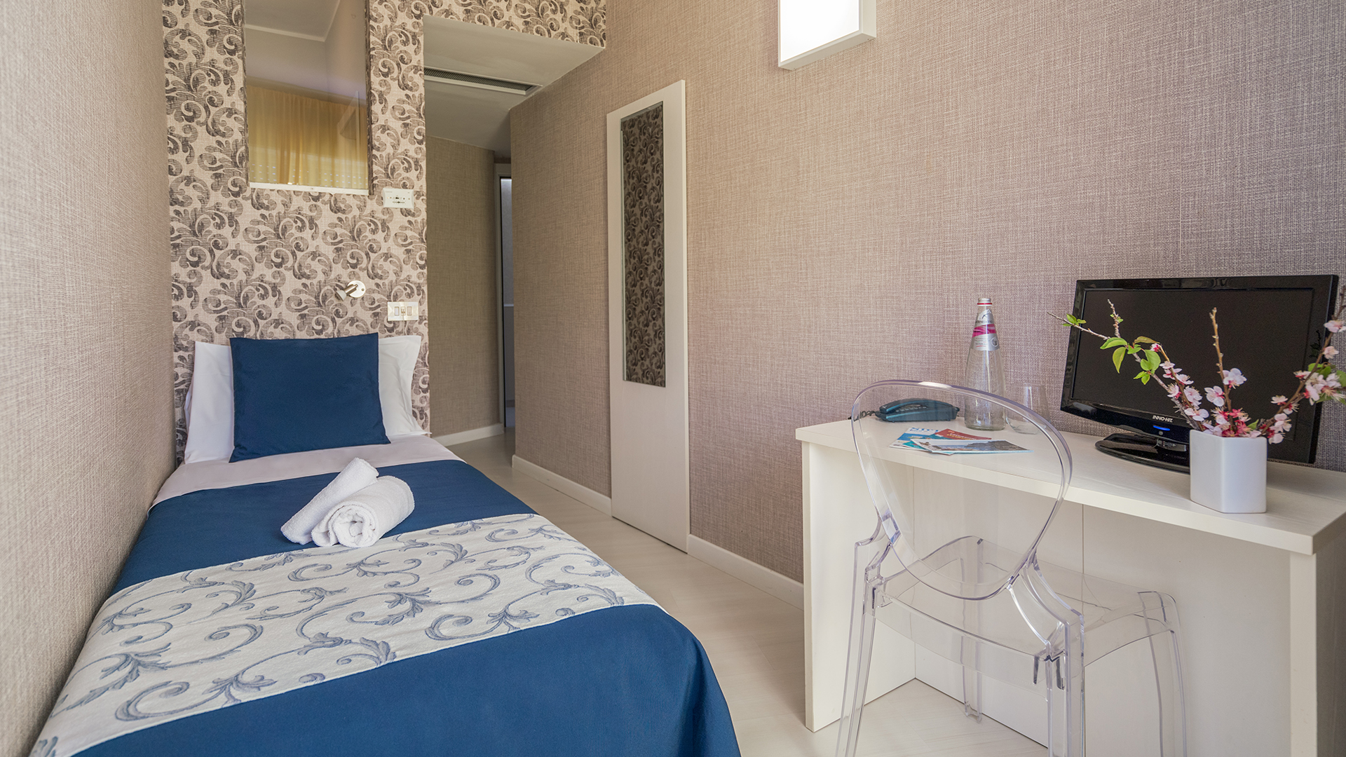Välkommen till Hotel Baia Azzurra – med fantastisk utsikt över staden och bukten Hotellet har ett härligt läge på den gröna sluttningen, endast 100 meter från strandlinjen och bukten. Från den öppna terrassen kan du njuta av panoramautsikt över havet – en perfekt plats för en lätt måltid eller en uppfriskande drink i vackra omgivningar. Hotel Baia Azzurra erbjuder en bekväm vistelse med bra faciliteter och ett centralt läge. Från hotellet är det endast 5 minuters promenad till linbanan som tar dig upp till Taormina – ett charmigt och praktiskt sätt att nå stadens historiska centrum. I Taormina centrum väntar ett pulserande stadsliv med ett stort urval av restauranger, mysiga glassbarer och olika butiker. Här kan du promenera längs bilfria gränder som slingrar sig genom staden, känd för sin inbjudande atmosfär och sina vackra utsiktspunkter över Medelhavet. Turistskatt Observera! Var uppmärksam på att (paket)resor till Sicilien är med reguljärflyg, vilket innebär att ändrings- och avbokningsvillkor avviker från villkoren för resor med charterflyg – se Amisols resevillkor. Avstånd Strand/Pool Barn Internet Restauranger/Barer Övrigt Standardrum för 1–3 personer Faciliteter (alla rum) Boendet på Hotel Baia Azzurra inkluderar frukost, som ger en bra start på dagen. Övriga måltider, snacks och drycker är mot avgift. Öppettider för restaurang och bar meddelas vid incheckning på hotellet.