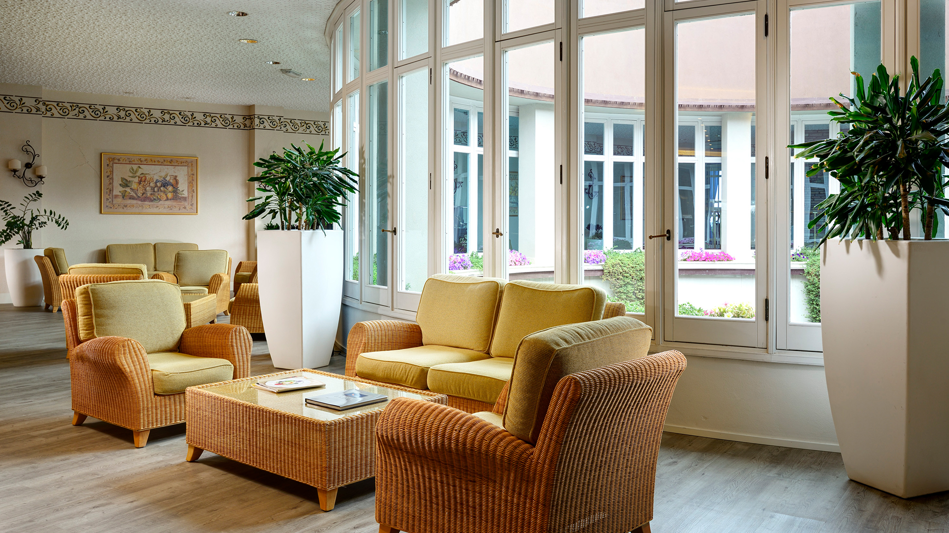 Trevligt inredda rum med utsikt över trädgården.