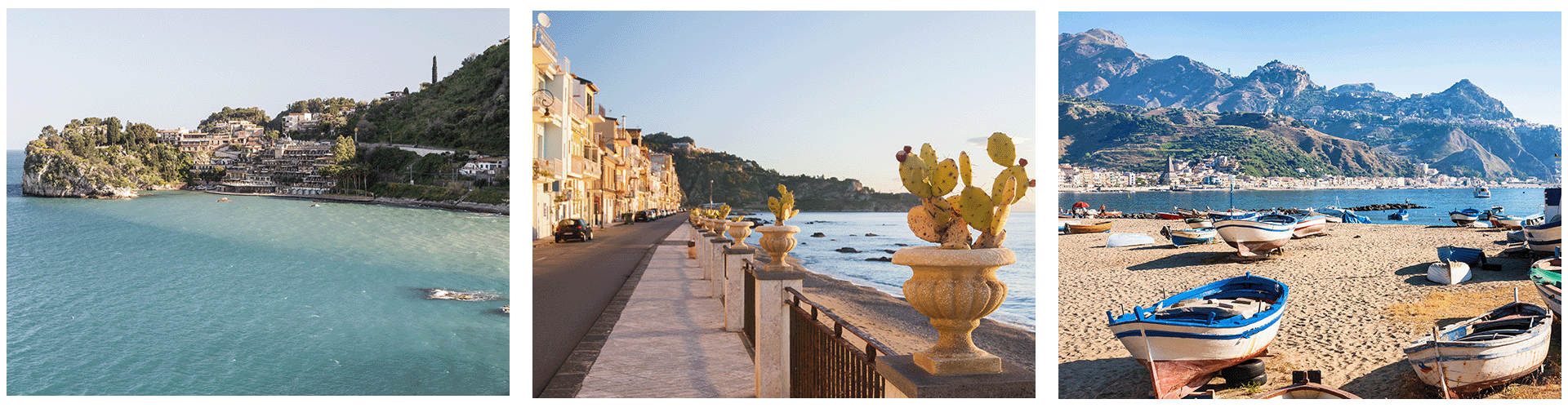 Amisols destination är centrerad kring den grönskande staden Taormina, som ligger på en bergssluttning. Här finns doftande citronträd, konstnärliga hotell och kyrkor, en antik grekisk amfiteater samt restauranger, kaféer och butiker av alla de slag. Om du stannar uppe på berget kan du ta linbanan till stranden, som ligger 200 meter längre ner, där det också finns fina hotell och matställen att välja mellan. Strax norr och söder om Taormina ligger två andra semesterorter, Letojanni och Giardini-Naxos, som är utmärkta resmål för familjer.