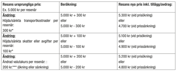 Rejsearrangøren forbeholder sig ret til, inden afrejsedagen, at foretage sådanne prisændringer, som skyldes ændringer i transportomkostninger (f.eks. brændstofpriser), skatter, afgifter eller gebyrer (f.eks. lufthavns-, start- eller landingsafgifter) eller valutakurser, som er anvendt til beregning af prisen for den pågældende rejse. Det gælder også selvom rejsen er slutbetalt. Hvis lufthavnsafgiften eksempelvis stiger kr. 100,-, forhøjes rejsens pris tilsvarende. Hvis prisen forhøjes mere end 8%, er kunden berettiget til at annullere rejsen og få det indbetalte beløb refunderet uden unødig forsinkelse og senest 14 dage efter annulleringen. Det er dog en betingelse, at annulleringen meddeles rejsearrangøren umiddelbart efter, at kunden er blevet underrettet om prisforhøjelsen. I modsat fald betragtes den rejsende at have accepteret prisforhøjelsen.
